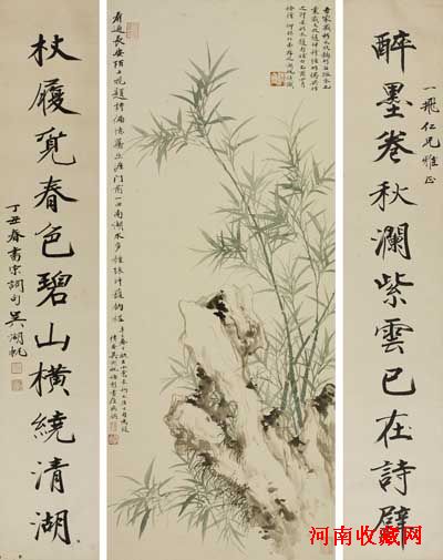 ①吴湖帆 行书对联 148.5×26cm×2 纸本立轴 ②吴湖帆赠陆抑非竹石图 83.5×34cm 纸本立轴 1、《吴湖帆纪念集》,54页 梅景书屋同门 2004年出版 2、《吴湖帆画集》上卷,第129页 北京工艺美术出版社 2006年1月出版 3、《吴湖帆画集》,第13页 上海人民美术出版社 1987年5月出版 4、《吴湖帆书画集》,第70页 上海书画出版社 2001年5月出版 成交价RMB 100.8万