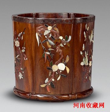 清中期黄花梨错银嵌百宝瓜棱形笔筒 高20cm 直径21cm