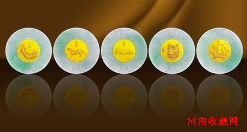 专家介绍,五枚“国宝虎王翡翠金”的主图来自中国历史上赫赫有名的五大国宝虎王——春秋玉佩虎、春秋玉卧虎、秦杜虎符、汉白虎、圆明园青铜虎,五大国宝虎王一直是皇宫深藏之物,价值连城,如今深藏故宫和各大博物馆,成为镇馆之宝,秘不示人。2000年,单是五大国宝虎王中距今最近的圆明园青铜虎(虎首),在苏富比香港春拍上现身,就创造了中国国宝生肖的价值记录,以1544多万元港币成交!如今五大国宝虎王破格同时亮相贺岁,再加上五大块直径达50毫米,种水上乘的缅甸天然翡翠以及10克黄金联袂打造,全套价值更是震人心魄!