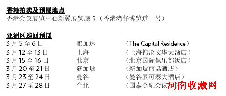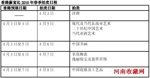 (香港,2010年2月) 据悉,香港苏富比将于2010年4月3日至8日,在香港会议展览中心举办春季拍卖会,届时呈献逾2,100件珍品,包括当代及现代中日韩及东南亚艺术、传统中国书画、中国瓷器及工艺品、珠宝、腕表及洋酒等,总估价逾10亿港元(1亿2,800万美元)。部份拍品将于3月在亚洲各地巡回展览,并于4月3至7日在香港公开展出。 苏富比亚洲区行政总裁程寿康(Kevin Ching)表示:“我们去年秋拍总成交比2009春拍高出88%,为香港苏富比创出了历年来第叁高总成交纪录,成绩骄人。本年春拍,我们将继续献上一系列来源优越可*,且鲜见于市场的顶级拍品,包括难得一见的洋酒、书画及其他艺术珍品等私人珍藏。此外,我们亦获委托拍卖稀世非凡 De Beers‘千禧蓝钻’—— 一枚5.16卡拉梨形内部无瑕鲜彩蓝钻指环,绝对是件令人惊艳的珍品! 综观全球艺术拍卖市场,信心和市场增长皆有攀升之势,其中亚洲表现尤为出众。国际以至亚洲区内新进藏家迅速冒起,当中以中国最为突出,为市场发展注入动力。我们本年的春拍,正为世界各地收藏家带来另一个搜罗卓尔不凡顶级珍品的绝佳机会。”