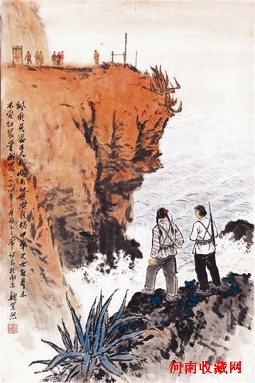 于本月27、28日在南京举办的“经典夜宴——2010中国书画迎春拍卖会”推出国内首次“魏紫熙绘画专场”。其中最引人注目的当属6件上世纪五六十年代的人物画。其中红色题材《海岛女民兵》(见图)描绘了9个女民兵,在红日映照下背着武器在海边站岗放哨,瞭望着壮阔的大海,题跋是毛主席诗词“飒爽英姿五尺枪,曙光初照演兵场。中华儿女多奇志,不爱红妆爱武装”。另外他在福建写生时创作的《擦弹》、《战士伙房》和《海军》,曾多次以画册出版,是其极为重要的红色经典作品。此外还有表现社会主义劳动场景的《秋菜田》和《收获图》也亮相拍场。