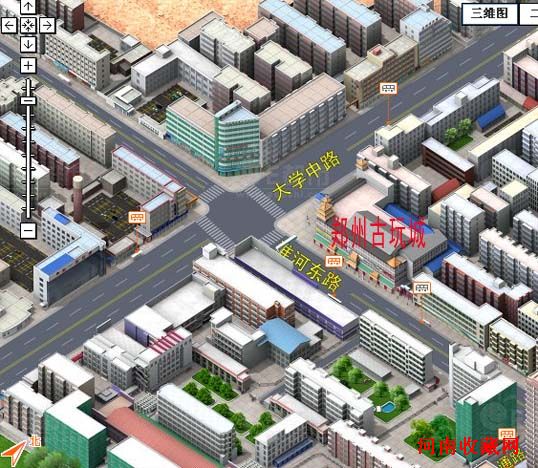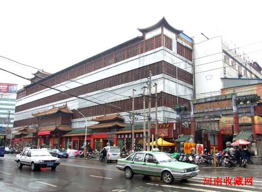 南区“郑州古玩城”位于郑州市大学中路49号,营业主楼是在唐代夕阳楼遗址上根据文献记载和诗人的意境复原建成的仿古建筑,建筑面积26000平方米,1998年2月开业,现有商户800余家,从业人员2400余人, 2004年荣获中国第二大古玩市场称号。