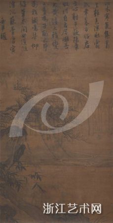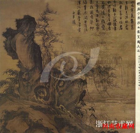《灌木丛篁图》水墨绢本,117.5*59.8CM,题识云:“灌木寒气集,丛篁静色深。冰霜岁聿暮,方昭君子心。射干蔽豫章,慨惜自古今。嶰谷失黄钟,大雅变正音。为子酌大斗,为我调鸣琴。仰偃草木间,世道随浮沈,苏台唐寅画并题”。从画面用笔结构观之,系出子畏晚年。题字结体,纯用硬笔中峰,出孟頫而兼北海,沉着痛快,迅捷劲健。画中灌木一丛,枯蔓数缕,远处以淡墨绘丛竹而略带薄雾,近处饰以清湾浅滩,坡石兰竹。整个画面清隽而稍带荒寒之气。子畏画异军突起于吴门诸家,与文、沈相较,风骨有别,盖其主要取法于南宋院人之体范,观是画信然。