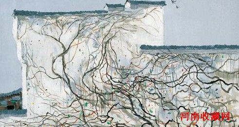《墙上秋色》(估价680万元)是吴冠中风格转变时期的重要作品之一,以国画江南风景系列的笔法、线条运用到油画上,并将油画语言中点、线、面,融合成整体。它的造型,显然受到西方现代派的启示,但它使用的材料——笔墨、颜料、纸张,却是东方的。