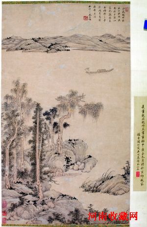 “清初四王”之一的王鉴作于?1663年的立轴《溪山渔隐》,据作者题识:“余藏赵仲穆溪山渔隐,后为孙少宰以定武兰亭易去,时形之梦寐,闲窗息纷,漫师其法。”由此可见,作品出自这位以摹古闻名但又自成一格的清代名家的手笔。那是时年66岁的王鉴,因其酷爱赵孟頫次子赵雍的《溪山渔隐》图,而在原作与友人交换定武兰亭多年后根据自己的记忆仿作的。专家指出,和赵雍原画相比,王鉴借用了赵雍原画的坡石组合但变换了位置,其山水草木呈现了赵孟頫《秀石疏林图》的画风,而其细笔勾勒的人物则线条劲挺,刻画入微,是王鉴的独创。