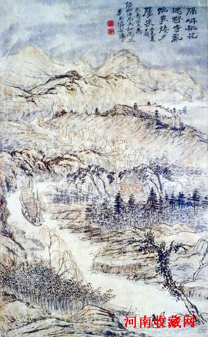 这幅作品历来被石涛研究者称为《枯墨赭色山水》,而见诸多种石涛作品的著录,其中包括清光绪年间程霖生辑录的《 石涛题画录》、石涛学开山之作——傅抱石1941 年编的《石涛上人年谱》、俞剑华1947年编的《石涛年表》以及徐邦达1995年的《改订历代流传绘画编年表》。有趣的是,上海工美在此番推出时,根据石涛的题识“隔岸桃花迷野寺,乱帆争卷夕阳来”,而将其命名为《隔岸归帆》。题识还记载:“己未夏日过永寿方丈为语山法兄大和尚正,弟元济石涛。”著名的当代石涛研究专家汪世清,据此澄清了石涛研究中有关康熙十八年石涛“画踪”的一段公案,确认当时的石涛,并非如许多石涛学者所认为的那样往来于宣城和溧水之间,而是往来于南京与溧水之间。
