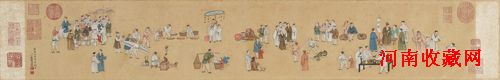 清朝宫廷画师丁观鹏的《太平春市图》卷距今已过二百余年风雨,却保存良好,品相如新。丁观鹏擅画人物、道释、山水,其画风工整细致,曾得郎世宁亲授,得西方绘画的透视法和光影画法真传,所绘人物形象逼真,极得乾隆皇帝赏识。此作成于乾隆九年(1744年),描绘了新春时节乡间欢乐的景象:乡人互相打躬作揖,摊市吆喝,货郎担夫,盲人看相,鲜活逼真,极具生活气息,将乾隆时期的繁荣市景具一呈现,兼具艺术性与历史性。全卷画八十一位人物,卷内左下角题款:“乾隆九年甲子秋日,臣丁观鹏恭画。”该作品著录于《石渠宝笈三编》,五年前在法国某拍卖会露面,即拍出约合人民币500多万的高价。据该公司图录文字称,是图原为法国拿破仑军队中一位军官旧藏。专家认为此作品应为圆明园被掠文物。