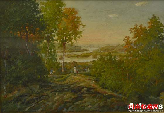 1931年颜文樑从欧洲购运回国五百多个石膏像、一万多册书籍资料。这对于当时的中国而言,他就像阿拉丁一样,手举着神灯,照亮那时并不平坦的漫漫艺途。他早期作品色调较为清冷。1928年游欧洲后则开始迷恋色彩,情调也豁然开朗。他经常以丰富的色块,用拍压的独特笔触使画面赋予生气和活力,在体现西方古典艺术严谨的绘画法则之余,吸收了印象派对光和色的细致描写。此次上拍这件《湖光春色》的表现形式和丰富的色彩较为充分的体现出颜文樑的独特画风。作品左边树林中画家刻意洒下几缕仿佛不经意照射的阳光,顿时使画面活跃起来,这束受光照的暖色与地面光影冷暖的反差,给绘画注入了空间和春的气息,洋溢着无限温馨的气氛。这种从光合中过滤出的冷暖色彩变化,增添出画面诗意境界的表现手法,运用在颜文樑的多幅代表作品中。油画《湖光春色》无疑是颜文樑一生绘画高点时期的作品。