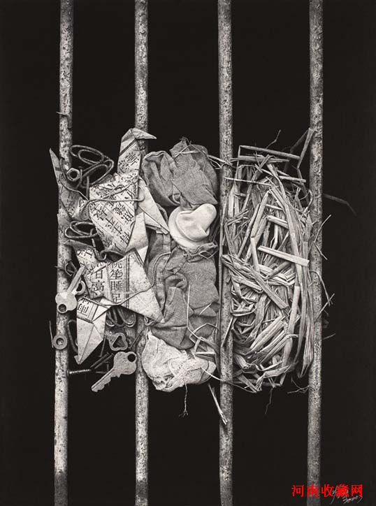 Lot47另一成员冷军,是写实画派最具个性的画家,他的作品风格较之其他成员相比具备前卫先锋的思想,和实验的表现手法。创作于2000年的《巢》,灵感来自于一件普通的日常生活用品——婴儿的“吸奶嘴”。制作过程中,画家先将这些“道具”在复印机上摆放成小型的装置,通过平面复印完成初稿,再用丙烯等颜料以超级写实的画法进行细致加工。画家用新鲜的手法,创作了一系列主观符号,在艺术成品表面的客观冷静下,隐含着创作者想要揭示的工业化时代下——人与被赋予了使用功能的“人造物”的微妙关系。