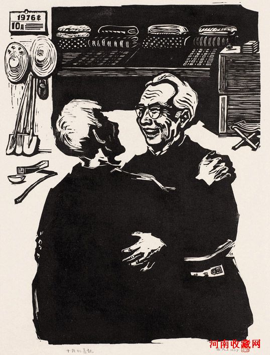 此次拍卖版画部分,除老一辈版画家李桦、古元作品为亮点外,还整体推出了1980年于日本举办的中国现代版画展参展作品。力求展现中国现代版画自兴起至蓬勃发展的整体面貌。古元《十月的喜讯》、《拆除春天的障碍》创作于1977年和1979年,均以粉碎“四人帮”为题材。Lot79《十月的喜讯》画面中心是两位年逾花甲的老教授激动得相拥而泣,教授衣袋中一封刚刚开启的书信和挂历上醒目的日期告诉人们发生了一个重大的历史事件:恶贯满盈的“四人帮”垮台了,他们将受到严正的审判。古元是一位艺术语言洗练,善用细节烘托主题的艺术家。老教授眼角的一颗泪珠、身后大通铺上叠放整齐的被褥、被当作桌子用的小木箱上摆放着《毛泽东选集》1-4卷、地上一把待磨的镰刀、政治学习用的小马扎、写有“五七干校”字样的草帽……这些看似随意实则精心安排的细节使作品呈现出“文革”特定的环境和鲜明的时代特点。另一幅lot80《拆除春天的障碍》,描绘的是“四人帮”统治时期,江青把北京的一些公园据为己有,北海公园成为她私人骑马的游乐场,不许市民入内,她被打倒后障碍清除,春天回归人民。此幅作品画面寓意深刻,工人拆除的不单是铁丝网,还是“四人帮”遗留下来的伤痕和障碍,前进的儿童是未来的象征,是社会发展的必然。古元以“文革”为题材的版画共创作了三幅,此次拍卖为其中二幅