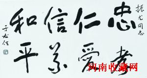 通过此次专场拍卖,观者一方面可以系统地了解右老的书法艺术,一方面可以读出右老的“真精神”。其中一件作品行书“忠孝仁爱,信义和平”为此次专场的重要拍品之一。这幅字体现了右老在上世纪50年代中期的典型书风,笔力劲健,体势生动,收放自如,且笔趣带有新意,浑厚中刚棱有锋,神采奕奕。上款“振尤同志”应为知名中医黄振尤。“忠孝仁爱,信义和平”是前秦儒家最为重视的伦理道德,简称“八德”。孙中山先生曾于《三民主义之民族主义》第六讲中诠释过推崇“八德”的重要意义。