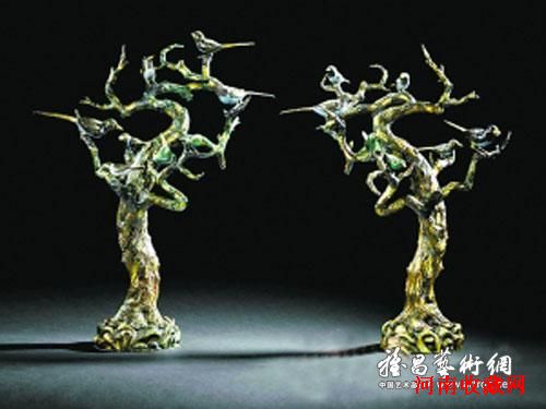 这件拍品中一对梅树枝干结构取态相似,相映成趣。专家介绍类似的珍品在任何文献中都未见记载,可谓绝无仅有。喜鹊又名“绶带鸟”,成群手工精细、神态生动、色彩斑斓的喜鹊栖立于梅树梢,是为“喜报春先”;而“梅”谐音“眉”,因此又有“喜上眉梢”的寓意。
