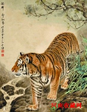 值得关注的展品有著名画家冯大中的画虎作品《凝眸》。冯大中先生画虎无数,好评如潮,他画的虎突破了传统的表现形式,沉静威严,画面博大,融情与景于山水间。此画作于1996年,作品出版于北京文物出版社出版的《中国近代书画精品集》。