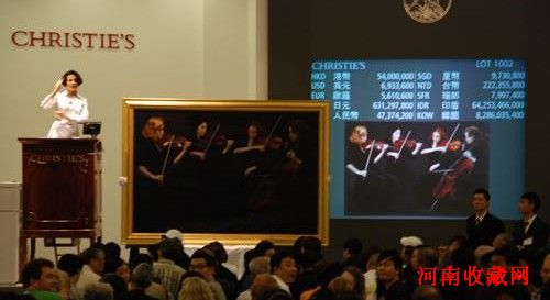 香港佳士得2010年春拍“亚洲当代艺术与中国二十世纪艺术”夜间拍卖于5月29日晚7点隆重举行。现场气氛热烈,到场的藏家及相关人士几乎占满了现场所能够立足的空间,拍卖结果也给在场的人们提交了满意答卷。此次夜拍成交率达100%,总交额达 303,360,000港元(266,137,728人民币)。其中,陈逸飞作品《弦乐四重奏》以6114万港元成交,夺得全场头筹并创艺术家个人作品全球拍卖成交记录;朱铭雕塑作品《太极——进步推拦捶》以1186万港元成交,创艺术家作品全球拍卖第三高成交价。另外,常玉《红色背景的百合花》、《仰躺的豹》分别以2530万港元和2194万港元成交,赵无极作品《02-01-65》、《14-3-59》均以2082万港元成交,取得喜人成绩。
