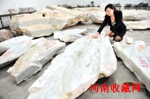 “我们搞玉雕设计非常注意料型。”国家级工艺美术大师、世博江苏馆镇馆之宝翡翠《螳螂白菜》的作者江春源摸着刚刚切割开来的一块玉料,心中已开始盘算玉石的设计。“这块玉料块长超过一米,重量超过一吨,已经具有了做大型玉白菜的基础。”江春源说,“扬州工”已经连续多年没有出大器精品,这批玉石的到来正好为他们提供了更加广阔的创作空间。