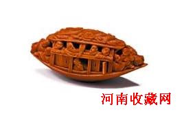 在杭州天工艺苑五楼艺术品馆中,记者见到了曾经在课本里读到过的《核舟记》中的精巧绝伦的核雕工艺品——《乘风破浪》。这粒核雕是由苏州艺人周水官在一粒长4.5cm的橄榄核上刻成船的形态,两面共刻有8扇窗子,均可打开,窗里坐着4人,整条船上共乘23人,无不形态各异、惟妙惟肖。此件精品自然不是书本记载描述的那件原物,但其工艺精美程度绝不低于其所描述。