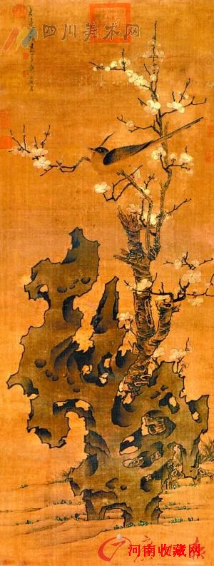 陈洪绶《梅雀》虽然画家用的是一般所谓工笔设色之法,但其精神却与粗简的大写意异曲同工。勾勒精简,枝头鸟蓄势欲飞。陈洪绶作品向来为世所珍,加上曾为皇家所藏更为难得。