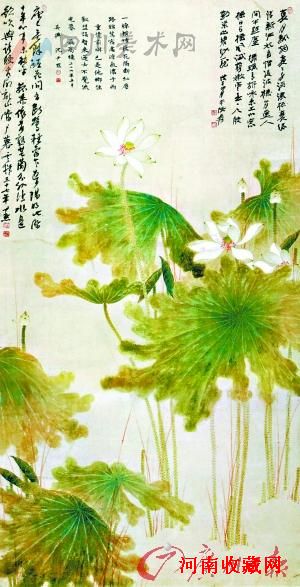 张大千《高洁图》,这是1948年张大千所绘的两件重要的“荷花图”之一,其中一件曾委托何香凝赠送毛泽东,现藏于中南海毛泽东故居。另一件即为此作,尺寸比前者更大,也是拍场上少见的张大千巨制。