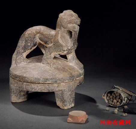 汉 白虎盖三足砂石砚(附汉墨1锭,墨丸126颗,青铜泥封1件,小研石1件)