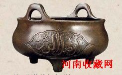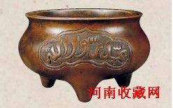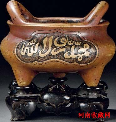 由此可见,在明代穆斯林文化已经渗透到广泛的流行器物中。明代阿拉伯文铜香炉即是在这样的背景下产生的。这一产物是穆斯林群体文化与中国本土文化相结合的产物,焚香已经成为广泛的穆斯林人的生活需要。中国本土铜炉之造型大多源于唐宋时期官、哥、汝、定等瓷器款式。这一本土造型在穆斯林的使用中便被添加了阿拉伯文这一特有的装饰元素。如开光手法:炉身开光处以变幻多姿的装饰性阿拉伯文“赞美真主阿拉”等内容。这些阿拉伯文书写随意性、装饰性强,取自可兰经中,但常常难以辨认,所以在这些阿拉伯文风尚流行的同时,其装饰作用远大于文字本身蕴含意义,也成为后世铜炉收藏的重要品类。