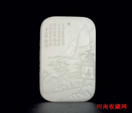 自小研习书法绘画的曹扬在业内颇具传奇色彩,其玉雕无师自通,系自学成才,天赋卓然与勤奋使他将玉雕与书画艺术融会贯通。《王维诗意》白玉牌,运用深浅浮雕雕琢茅亭、树木、江河、高士,浮雕技艺叹为观止,对茅屋上茅草的刻画更是细致入微。作品构图疏朗有致,层次分明清晰,远近景处理协调,已达尽善尽美之境。寒山,秋水,落日,孤烟等一系列富有时间和季节特征的景物构成了一幅和谐的山水画卷,达到了人和自然的和谐。所有的景物都感染了曹扬的主观感情色彩,它们不是孤立存在的,而是被赋予了灵魂,就好像一幅真实的山水风景画呈现在我们面前。背书诗词为王维酬赠裴迪之作,此五言律诗情景交融,不可单纯地当作写景诗或闲适诗来看,王维并非闲逸地描写辋川暮景以寄托闲居之情致,而是把景物看作时间意义的体现者,在写景的同时表达对生命的思索。曹扬将其对此诗的深刻体悟,以其墨韵淋漓的笔触呈现于玉牌之上,以宁静淡然的刀法表现出不宁静,在短暂中传达出了永恒。
