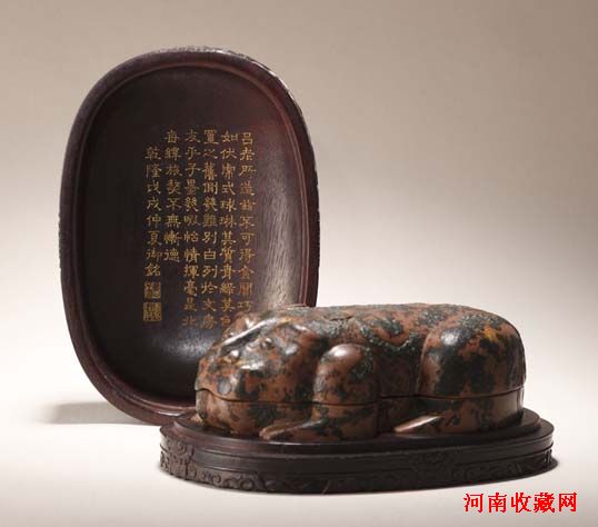 “乾隆御用”御题诗澄泥伏虎砚及紫檀盖盒 资料图片