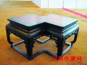 东方四美居此次参拍的复古中式古典家具共有7件,包括一对红木冰裂纹书柜、一对榆木书架、一对香枝木(降香黄檀)素面官皮箱,和一个大叶紫檀嵌香枝木菱形香几(上图)。邬涛介绍说,这个菱形香几据史书记载,本是康熙皇帝在书案上放置把玩的精致的“小玩意儿”。东方四美居的创作团队从中汲取创作灵感,将其按比例放大,用大叶紫檀和香枝木两种木质的天然颜色搭配,形成了一种强烈的色彩反差,完美地再现了中式古典家具的黑白木工艺。这个香几打破了日常生活中茶几所具有的长方、方、圆等一般形式,以两个交错的菱形展现,正好借助几何图形特点,放在当前家居大客厅宽沙发的格局当中实用又别致,无论是造型结构还是收藏和使用价值,都会深得使用者的青睐。