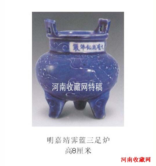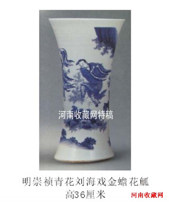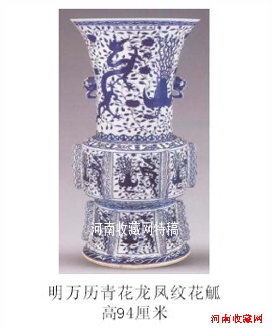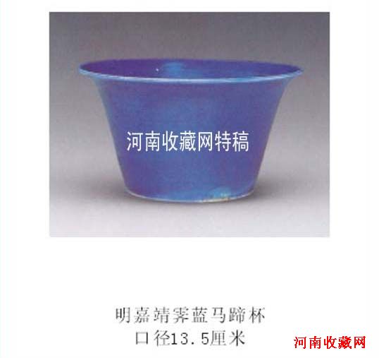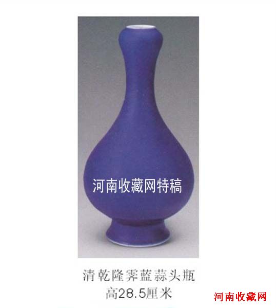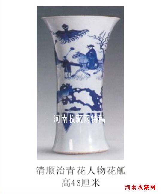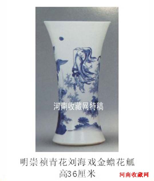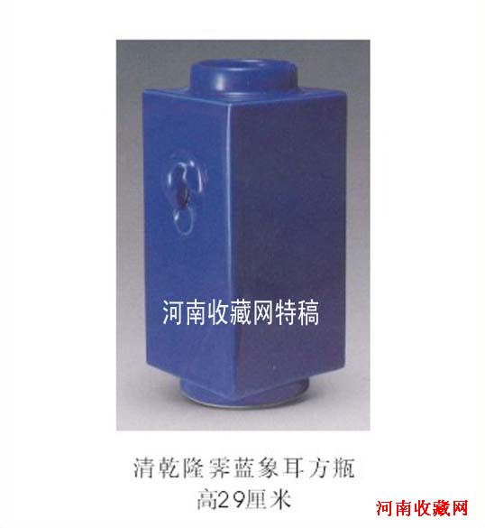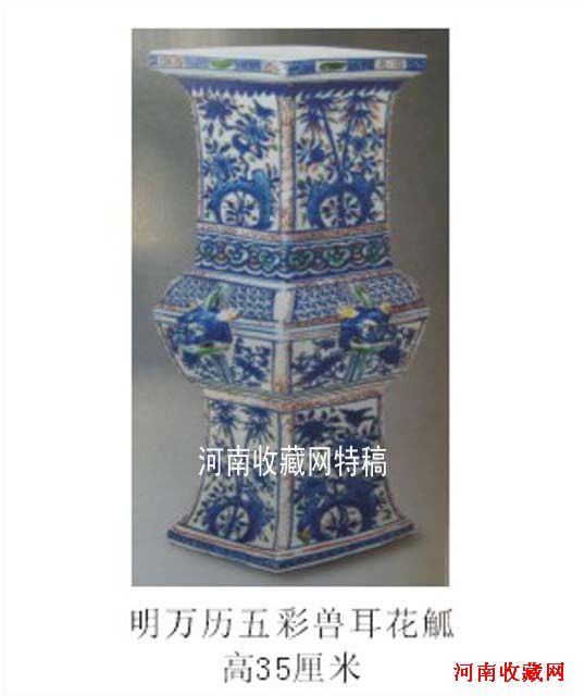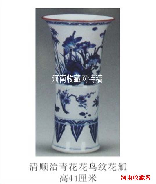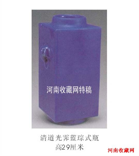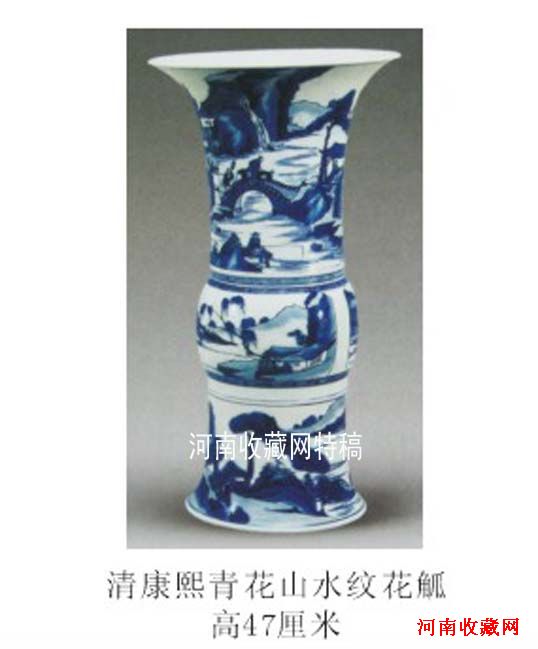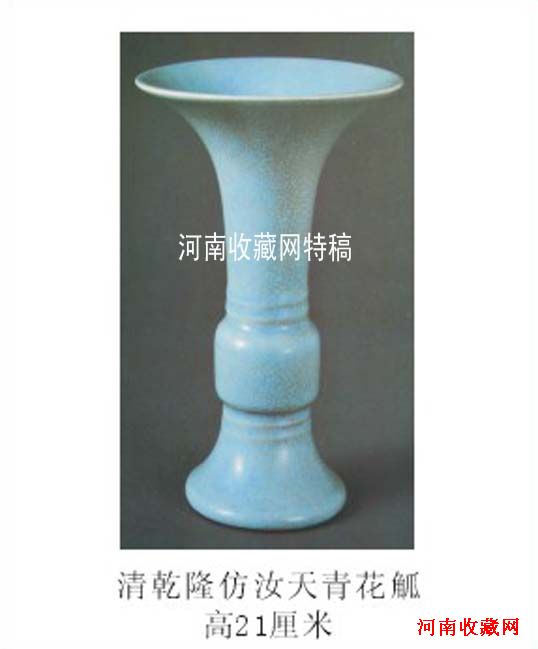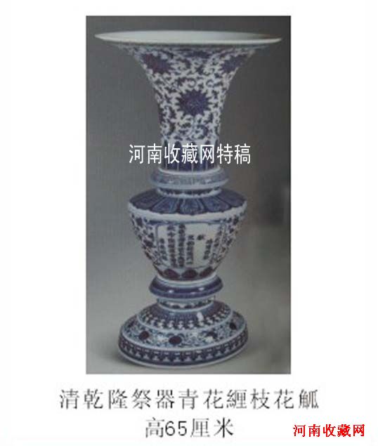 从文献记载查阅,从图录标本直观,从发掘器物与残器复原。五代,北宋没有蓝色花觚形制,这种造型是典型的清代器物,乾隆朝最盛行。当我拿照片给河南文物考古研究所所长孙新民看时,他随口答出“是明、清的东西”;当郑州市文物考古研究院院长张松林看到时,他不假思索地说“青代的东西”;河南省文物交流中心研究员赵文玺看着照片说:“五代没有花觚形制,宋元有花觚造型简约,明代瓷器多仿波斯金、银器,清代仿商周青铜器这是典型的仿商周青铜器觚”。