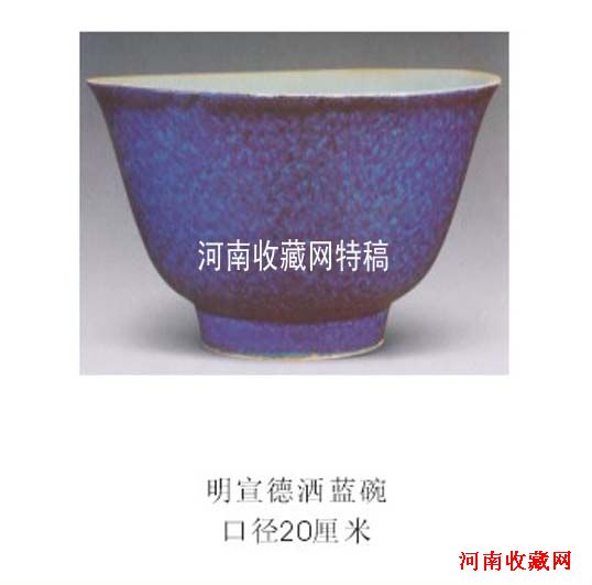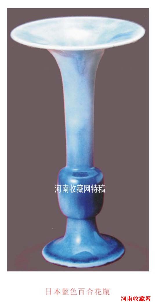 该书又记述:“蓝色以钴为发色剂。虽然氧化铁在还原气氛中也可能出现浅青和淡蓝色(月白),但氧化钴却是烧成美丽深蓝色的唯一发色剂。钴在唐朝传入中国,受到中国匠人的喜爱,氧化钴在强还原下的发色能力较其它金属元素强,烧出来的霁蓝(祭蓝)器皿,色调匀称,色彩光亮柔和,较易控制。但孔雀绿呈透明的蓝绿色(看标本花觚),是一种低温釉。到了清朝以碳酸铜加钠溶块做出来如宝石般的蓝色器,仍属低温釉。”真正的蓝色应盛於明、清。日本百合瓶只能以明清两代花觚去比对。