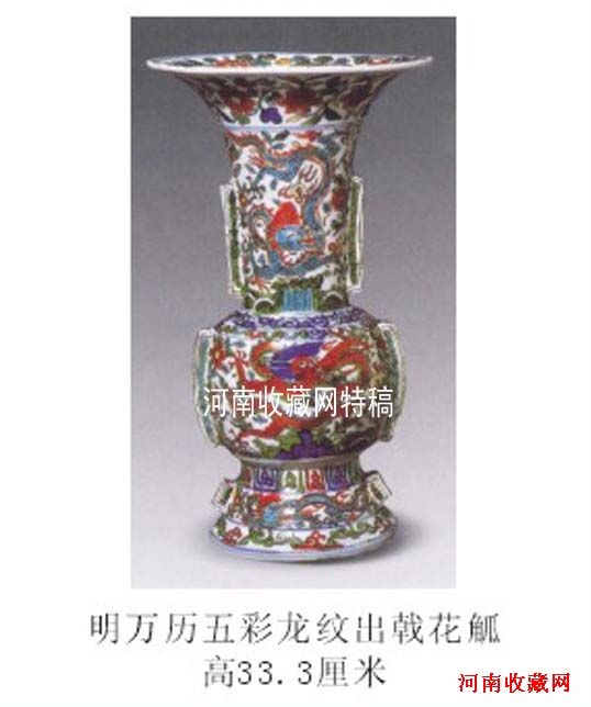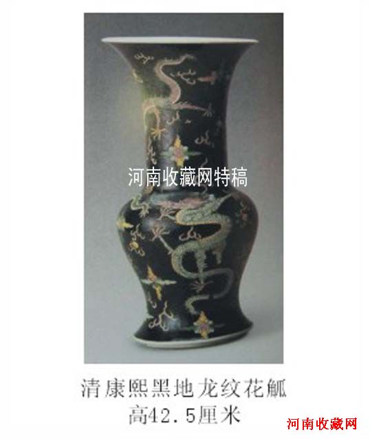 (4)《饮流斋说瓷》记述:“花觚,口大复小者谓之花觚。明代制者身段直下绝无波折。康熙朝以后则腰际凸起略,如香案中柿花之具矣。康仿明制粗,五彩花者为多,於粗率中更见老横。乾隆朝则有镂金错采锦堆片者,有一种,口绝侈,而身甚瘦直下无曲折,而身际有突螭一条者。”这里说明了花觚始於明盛行於清。