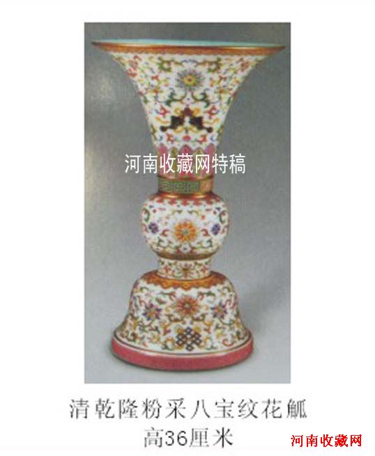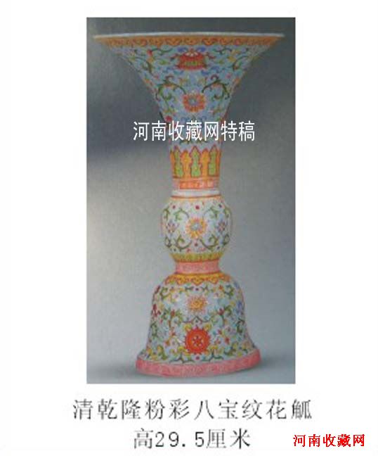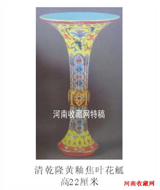 《古陶瓷识鉴讲义》记述:“陈设器应源起於明、清。明、清建筑,厅堂宏阔、宜设案几,并陈设器物其上,以布置空间。明中叶以下,又兴起将大型瓷器置于地,遂有鱼缸、花桶、地瓶摆设。又清初,官窑、民窑曾流行象腿瓶、凤尾尊、琵琶尊、观音瓶、棒捶瓶、方瓶、花觚等”。从标本看,乾隆朝花觚最多,造型与花色图案皆佳。