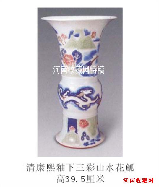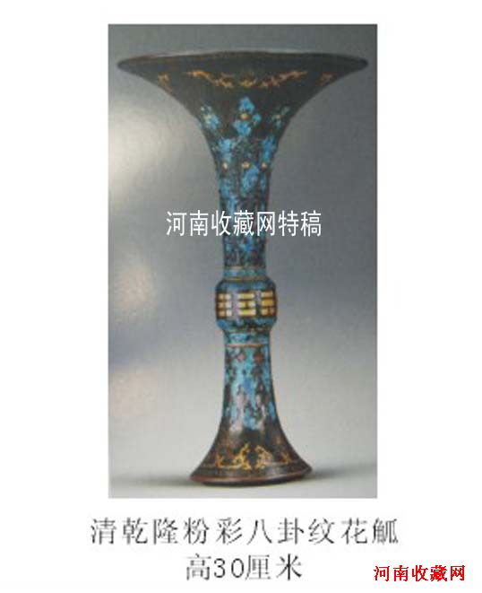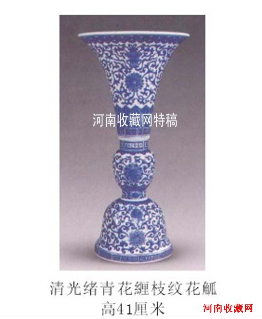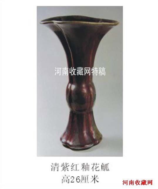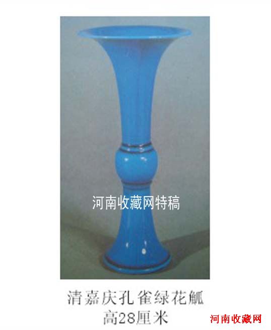 (5)《清代单色瓷器》记述:“从实物观察,我们发现清朝单色釉的器形变化极多,其中有仿古玉器或古铜器之琮、簋、簠、豆、觚、觯、以为礼器或室内装饰者。”说明清代的觚器多为仿青铜器觚。就标本看清朝花觚与郑州博馆珍藏之青铜觚极类似。