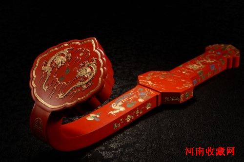 本件清康熙御赐朱砂如意为清代宫廷御制器物,为康熙朝康熙皇帝御赐的一件如意精品。如意柄面上阳文“御赐 康熙乙丑年新安堂按易水法监制。”的字样,由新安堂按易水法制如意,饰御赐龙纹、云纹、祥鹿等,龙珠填朱砂色,凤凰填金和朱砂,此如意寓富贵平安,吉祥如意之意。通体皇家气派极浓,此如意的与众不同之处在于其朱砂之存,器型之大,分量之重在传世如意里面是很少见的。