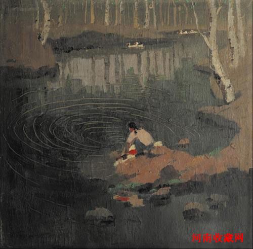 葛:《洗衣歌》与《春风》二件作品虽无款识,从作品面貌与收藏缘由可知为吴冠中真迹无疑,皆为吴冠中“粪筐”时期的典型作品。从吴冠中的经历与记载可以推断,这两幅作品应作于1972年或1973年的春天。画家以赤子童心般的眼光与感情选取题材,以千锤百炼的自家语言加以表现。。《洗衣歌》表现了河北青年妇女在北方河道中的洗衣场景,那优美朴实的动态身影 那水因洗衣而起的圆浪以及中景与远景中的白鹅与桦树,使画面赋于了浓郁的地方色彩与诗意。