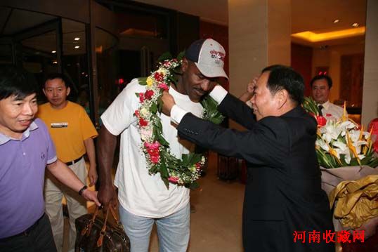 酒店总经理荆汝彭(右)佩戴花环,欢迎世界拳王霍利菲尔德(中间)下榻银都大酒店