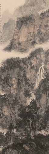 傅抱石“金刚坡”时期的山水画创作,已经形成了个人的风格特征,即在继承宋画宏伟章法与元人水墨逸趣的基础上,注重畅写山水神情,以气取势,磅礴多姿,自然天成。同时傅抱石的画法也一变传统的笔墨皴法,以散峰,乱笔来表山石的结构,形成独特的“抱石皴”。