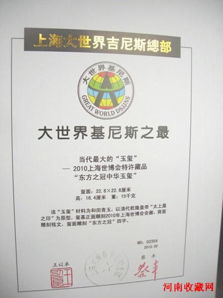 据悉,中国2010上海世博会盛大开幕之后,一款中国独有的世博文物级特许藏品世博国玺——15公斤和田玉【东方之冠·中华玉玺】正式发布,其形制体量为历代之最,被吉尼斯纪录认证为“史上最大玉玺”,于近日在北京工美集团白孔雀艺术世界的世博特许专卖店亮相。