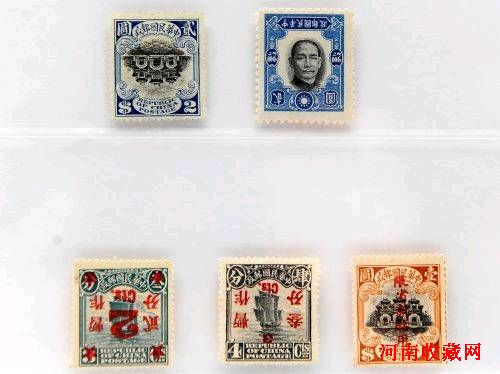 7月27日媒体预展会上拍摄的中华民国时期的“民国五珍”,估价300万港元。五枚珍邮之中,又以1925年北京二版帆船邮票4分暂作3分(红字)倒盖新票(下排中)最为珍罕,其拍卖前估价乃100万港元。其余四珍包括:1941年纽约版孙中山像2圆中心倒印错体新票(上排右)、俗称“宫门倒”的1914至1919年北京一版帆船邮票2圆中心倒印新票(上排左)、1923年北京一版帆船邮票3分暂作2分(红字)倒盖新票(下排左),以及当时仅于新疆省通用并相信存世可考者少于12枚的1915年北京一版帆船邮票加盖“限省新贴用”错体1圆新票(下排右)。