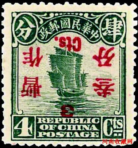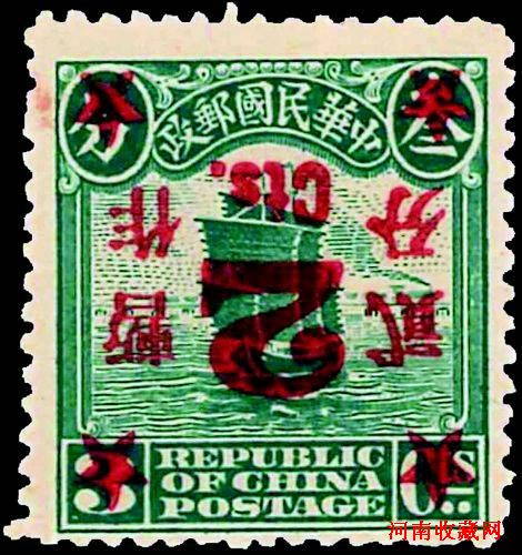 7月27日媒体预展会上拍摄的中华民国时期的“民国五珍”之一的1925年北京二版帆船邮票4分暂作3分(红字)倒盖新票。