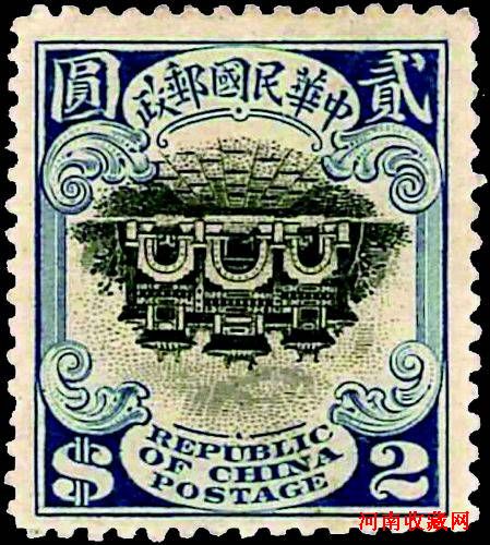 7月27日媒体预展会上拍摄的中华民国时期的“民国五珍”之一的俗称“宫门倒”的1914至1919年北京一版帆船邮票2圆中心倒印新票。