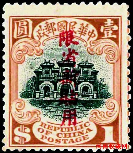 7月27日媒体预展会上拍摄的中华民国时期的“民国五珍”之一的当时仅于新疆省通用并相信存世可考者少于12枚的1915年北京一版帆船邮票加盖“限省新贴用”错体1圆新票。