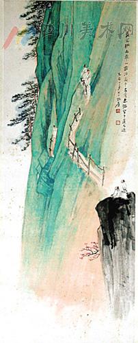 此外,张大千描绘华山长空栈道险峻奇崛的《华山行》,以145.6万元成交。张大千于1935年游浙江莫干山、洛阳龙门及西安、华山,并为此举办了“关洛纪游画展”,《华山行》即创作于此时。在似青绿山水却又色不重的大片绿中,画一长空栈道,着以赭色,十分醒目。空栈上端点两游者,相背、扶壁而立,一者小心看风景,似不敢再往前;一者已有悔意,正想返身而下,这正应和了画面的款识“予每度来游,皆中道而返”,或许是大千自己的写照吧。
