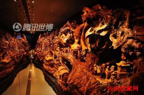 当游客缓步通过20米长的通道,来到河南馆藏宝室后,都对大型根雕《清明上河图》发出感慨。幽幽的环境、淡淡的灯光、千年的古樟木,无不衬托出这个反应千年前北宋繁荣都市的根雕的神秘;车夫、船夫、游人,一个个栩栩如生的人物,似乎都在诉说着那个时代的生活沧桑,让人不由驻足观看,流连忘返……