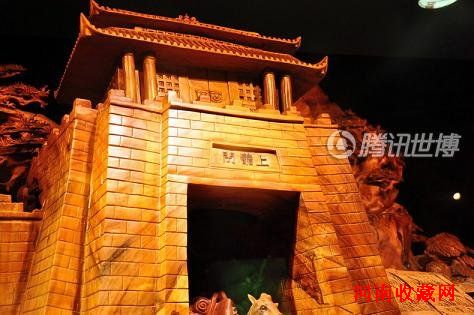 据讲解员介绍,这件巨型根雕并不是文物,在运抵上海之前,一直保存在开封艺术中心。河南馆藏宝室的展览分为两个部分,一部分是“国之瑰宝”,例如4000余年前的陶质水管、东周时期代表最高礼仪的九鼎八簋;另一部分是“文明之根”,所指的就是这件根雕。整个藏宝室展出的均是“国宝级的原件”。至于为什么挑中了《清明上河图》根雕作为镇馆之宝,则与开封这座城市有密不可分的关系。