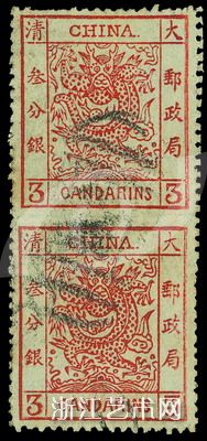 1883年海关大龙3分银棕紅色直双连中縫漏齿邮票