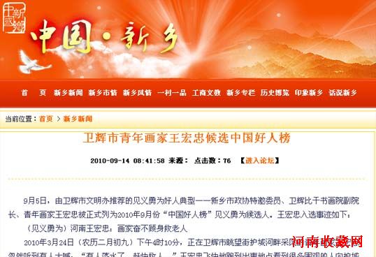 9月5日,由卫辉市文明办推荐的见义勇为好人典型——新乡市政协特邀委员、卫辉比干书画院副院长、青年画家王宏忠被正式列为2010年9月份“中国好人榜”见义勇为候选人。王宏忠入选事迹如下: