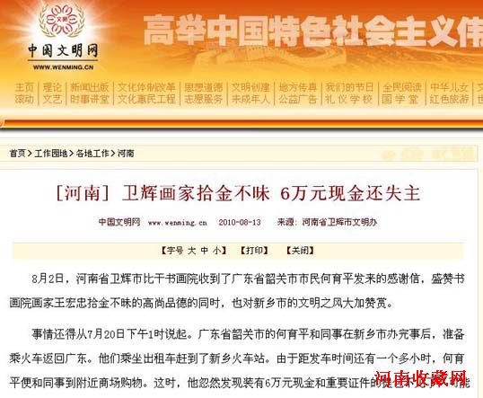 8月2日,河南省卫辉市比干书画院收到了广东省韶关市市民何育平发来的感谢信,盛赞书画院画家王宏忠拾金不昧的高尚品德的同时,也对新乡市的文明之风大加赞赏。