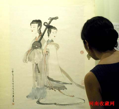 月15日,工作人员在观看傅抱石1945年作品《罢阮图》。此作品估价为500万至700万港元。 李秋婵 摄