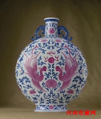 清乾隆青花胭脂红料双凤戏珠纹凤耳扁壶