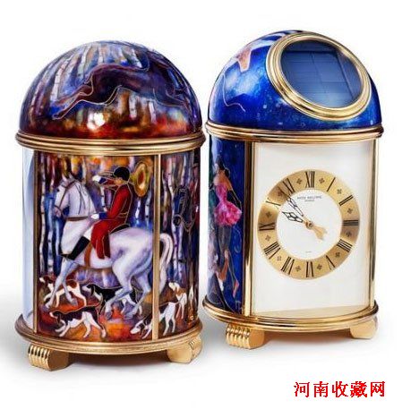 百达翡丽,镀铜金,掐丝珐琅彩绘狩猎景,太阳能电子座钟,卡地亚发行,1965年制